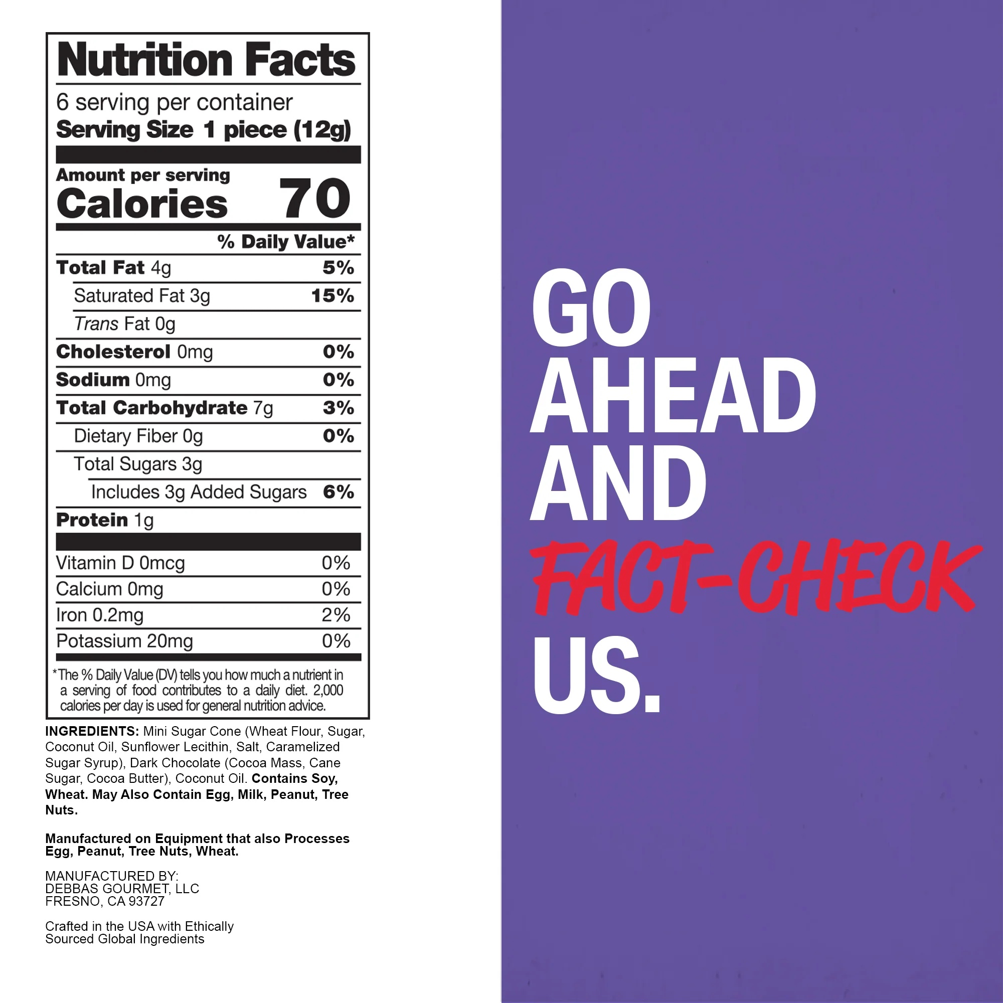 Mini Sugar Cone (Wheat Flour, Sugar, Coconut Oil, Sunflower Lecithin, Salt, Caramelized Sugar Syrup), Dark Chocolate (Cocoa Mass, Cane Sugar, Cocoa Butter), Coconut Oil. Contains Soy, Wheat.